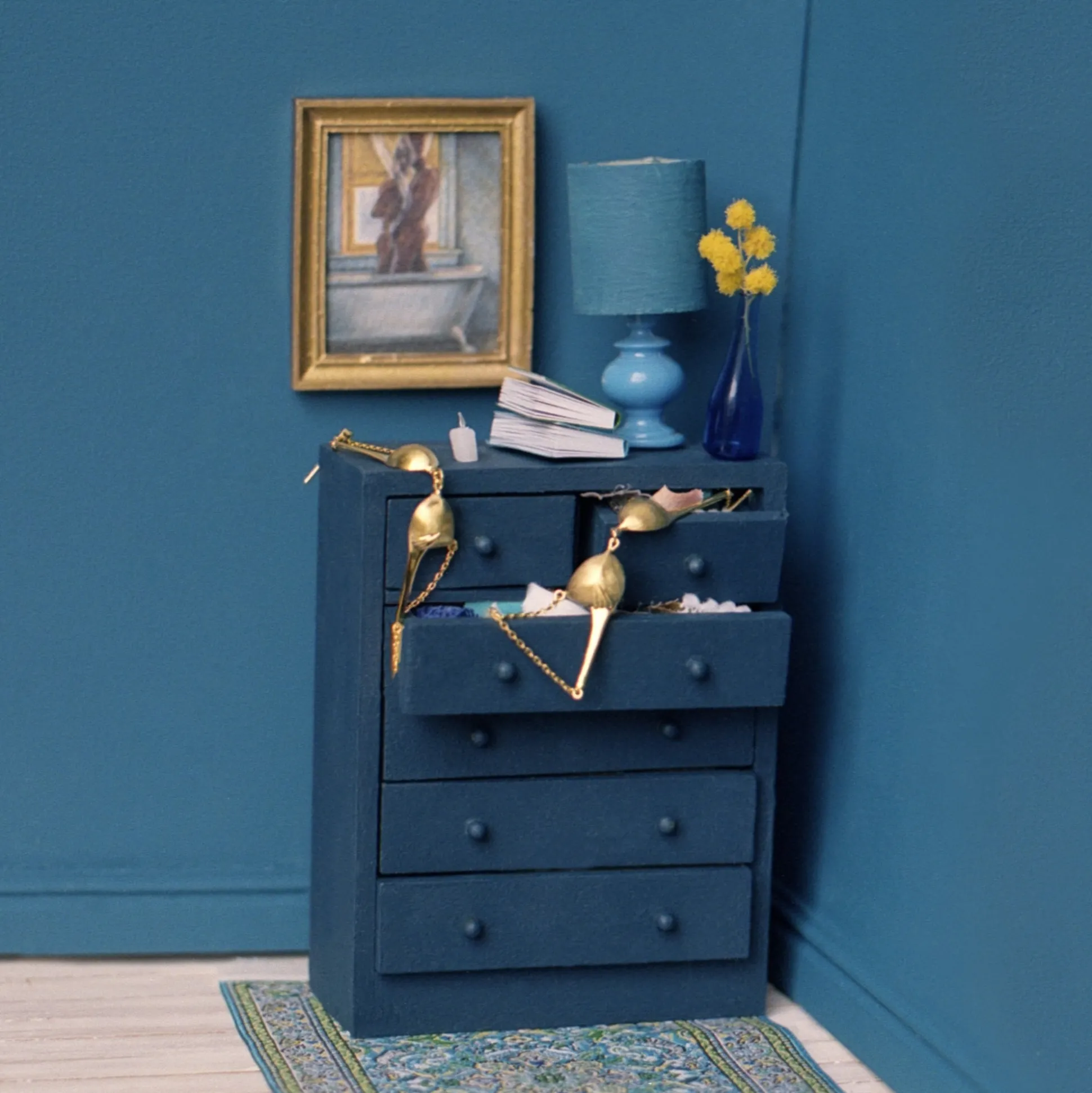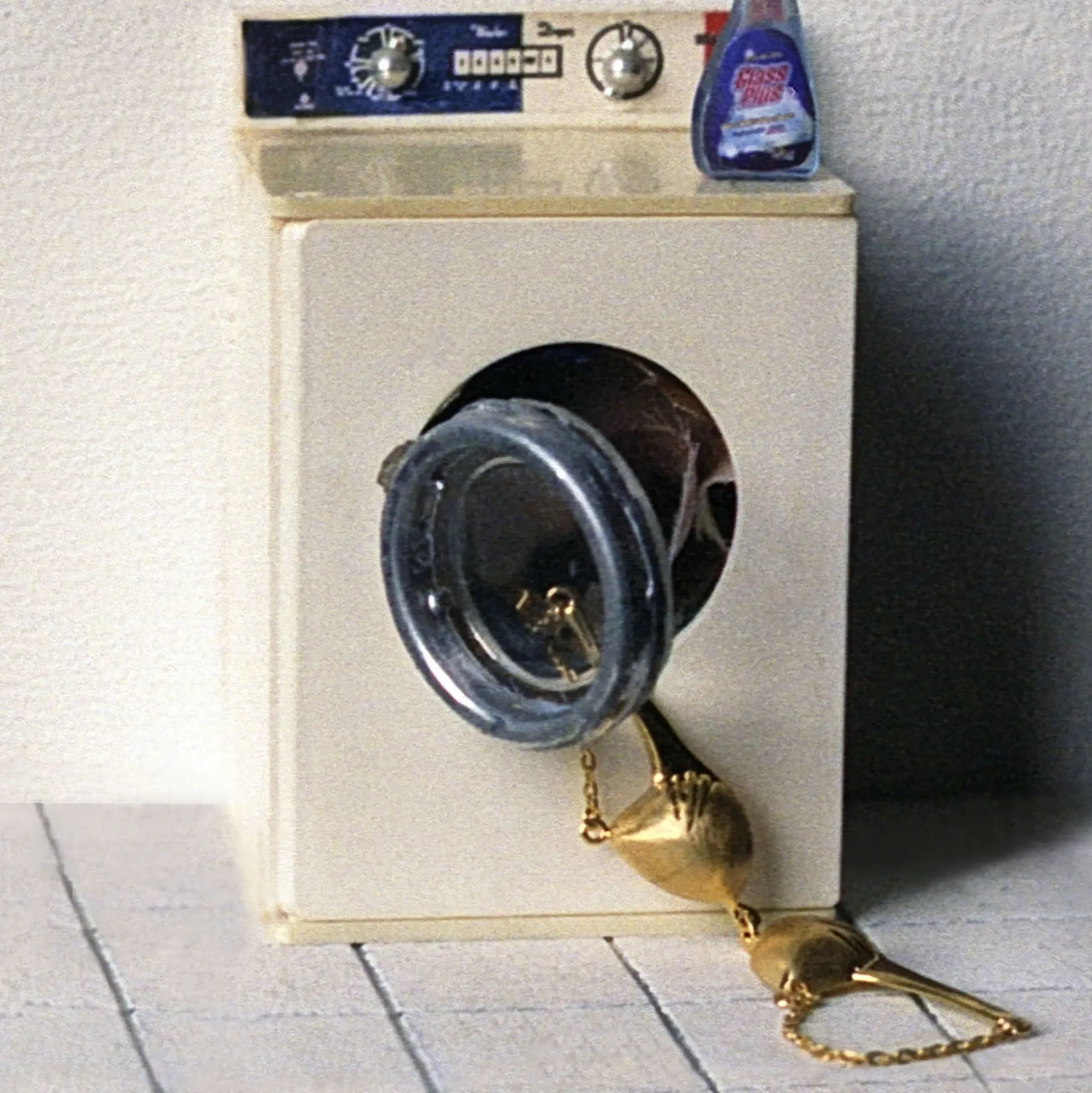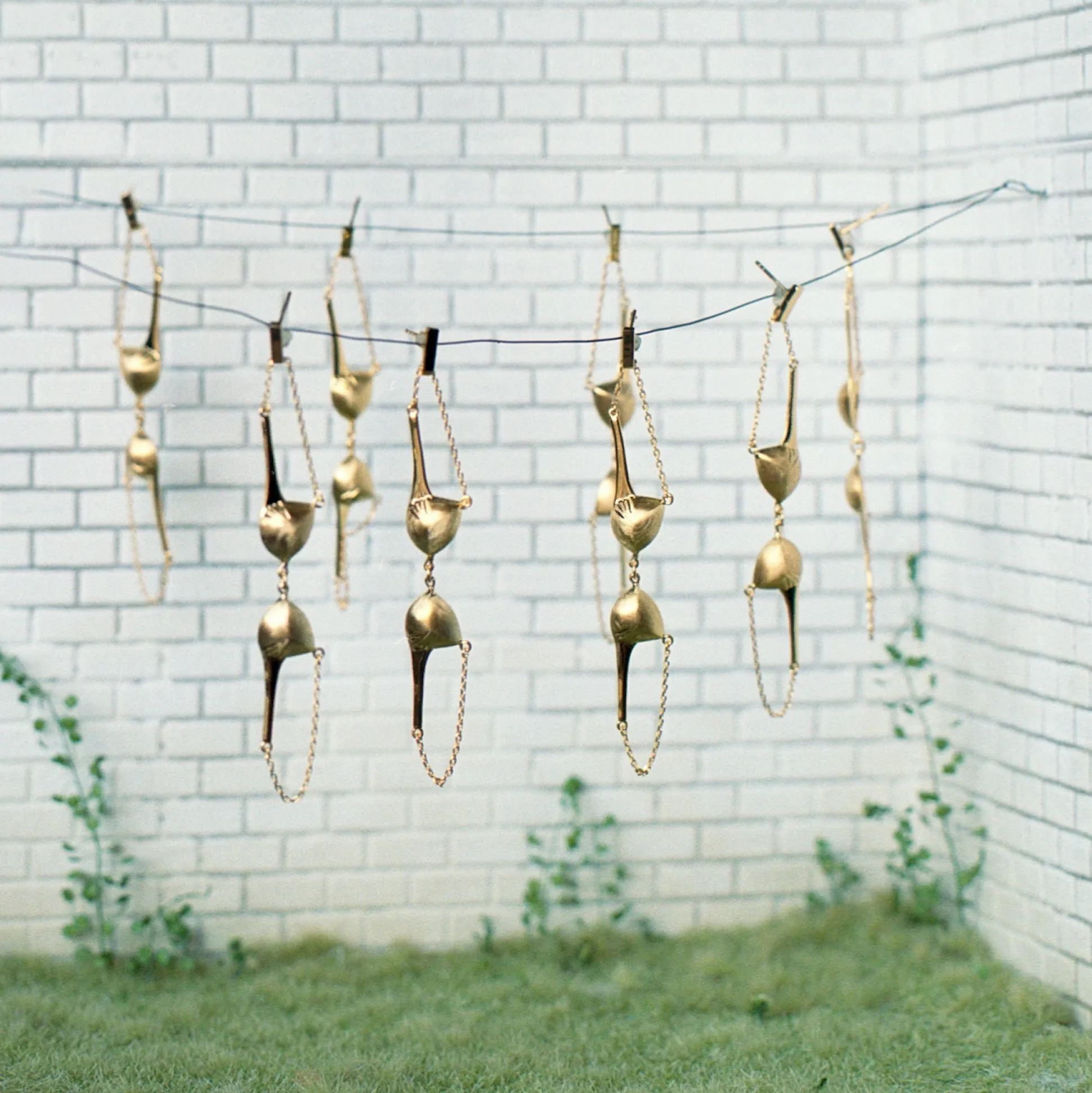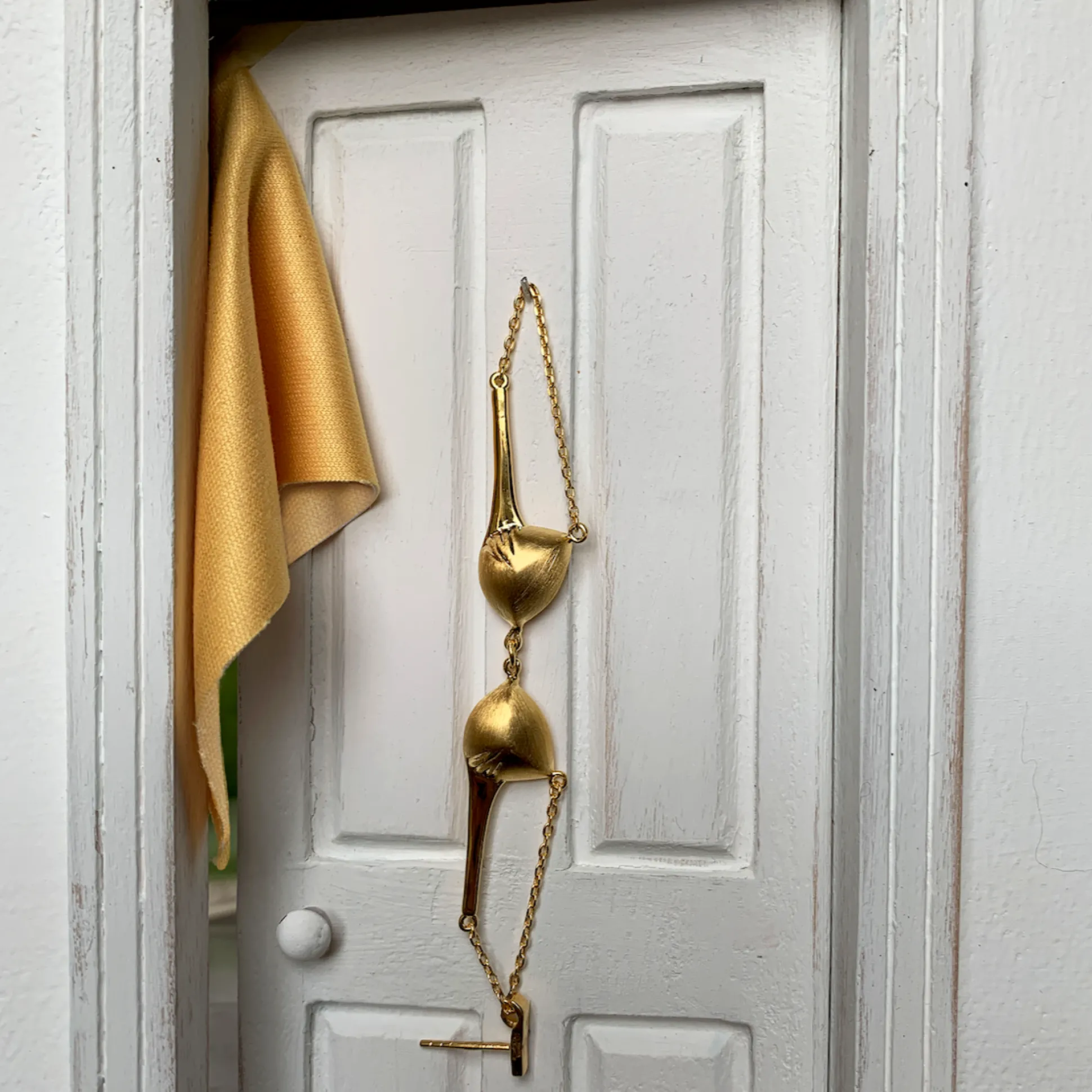 Fabriqué À Partir De Laiton Plaqué Or. , Il Comporte Des Bonnets Gravés Et De Délicates Sangles En Chaîne Qui Pendent À Une Pince À Linge, Comme S’Il Séchait Sur Une Corde À Linge.