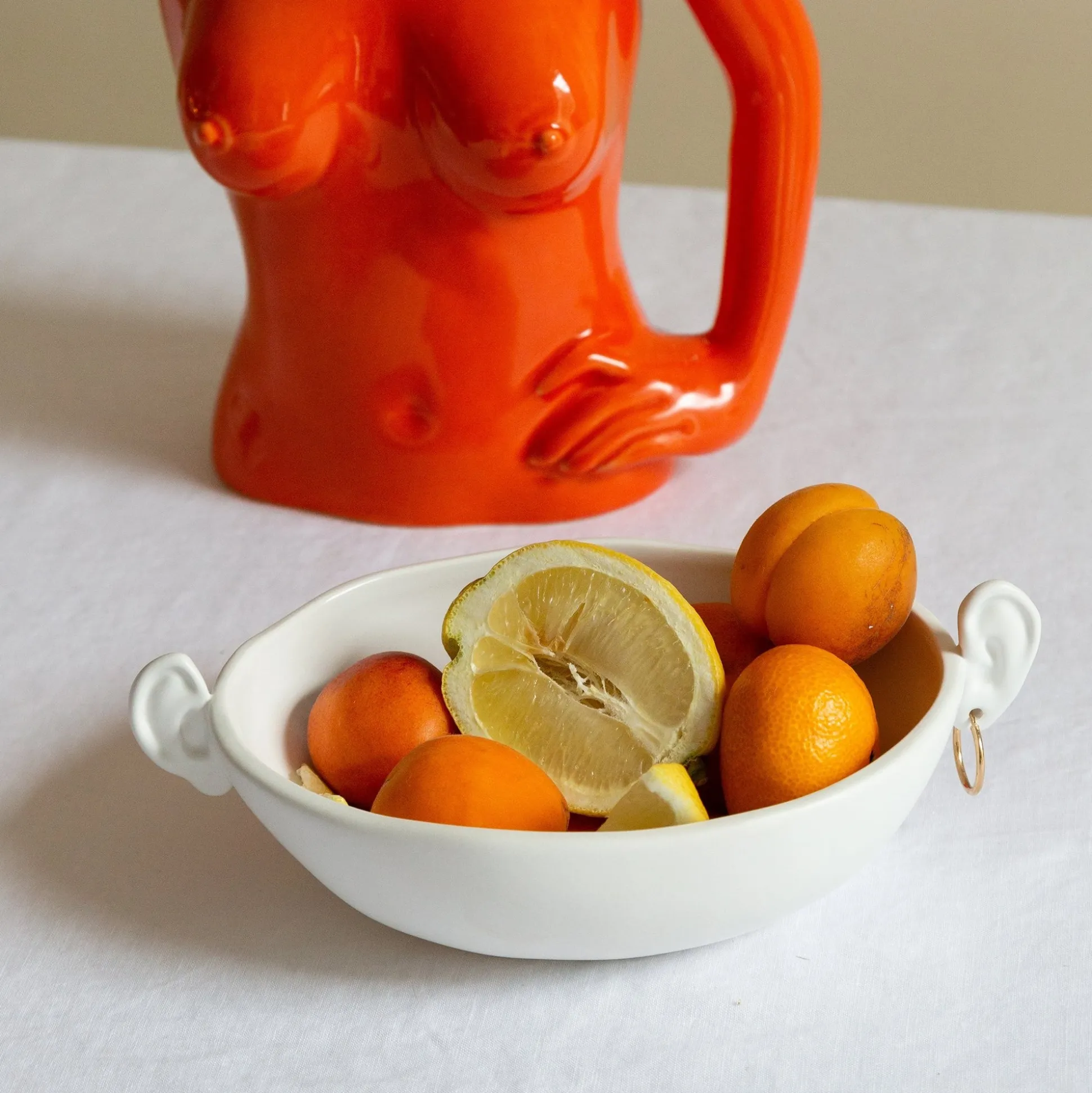 Pourquoi Quelque Chose De Fonctionnel Doit-Il Être Ennuyeux ? Une Excellente Pièce Maîtresse Pour Les Fruits, Ce Mini Bol D’Oreille Amusant Est Fabriqué À Partir De Céramique Blanche Recouverte D’Un Vernis À L’Intérieur. Regardez Attentivement Les Poignées En Forme D’Oreille Et Vous Verrez Que L’Une D’Elles Est Percée, Ce Qui Signifie Que Vous Pouvez La Personnaliser Avec L’Une De Vos Boucles D’Oreilles.